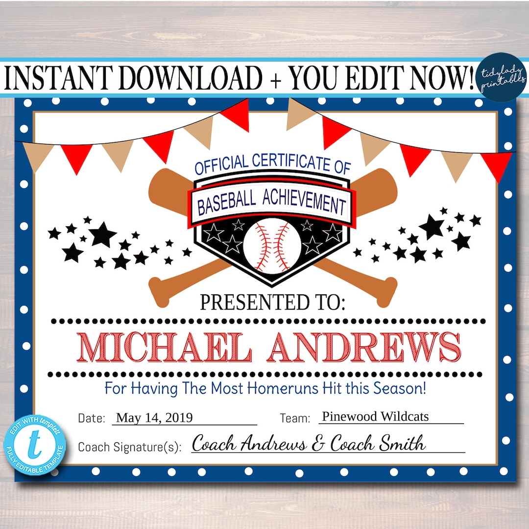 Editable Baseball Award Certificates INSTANT DOWNLOAD PRINTABLE Worksheets Library