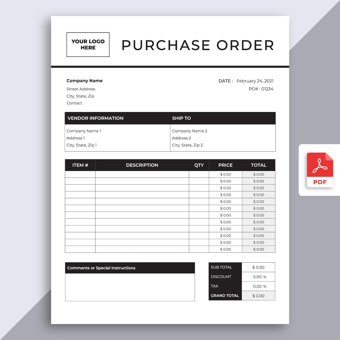 Purchase Order Template Fillable PDF Editable Professional Business Form Order Sheet Digital Form Etsy