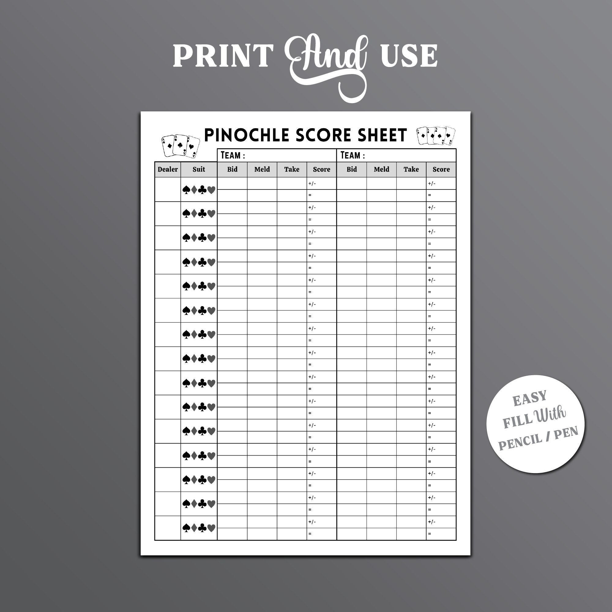 Our free printable Pinochle score sheets are designed for convenience and ease of use. Simply download and print as many copies as you need for your game night. Each score sheet includes sections for keeping track of points for both teams, making it easy to stay organized and focused on the game.
