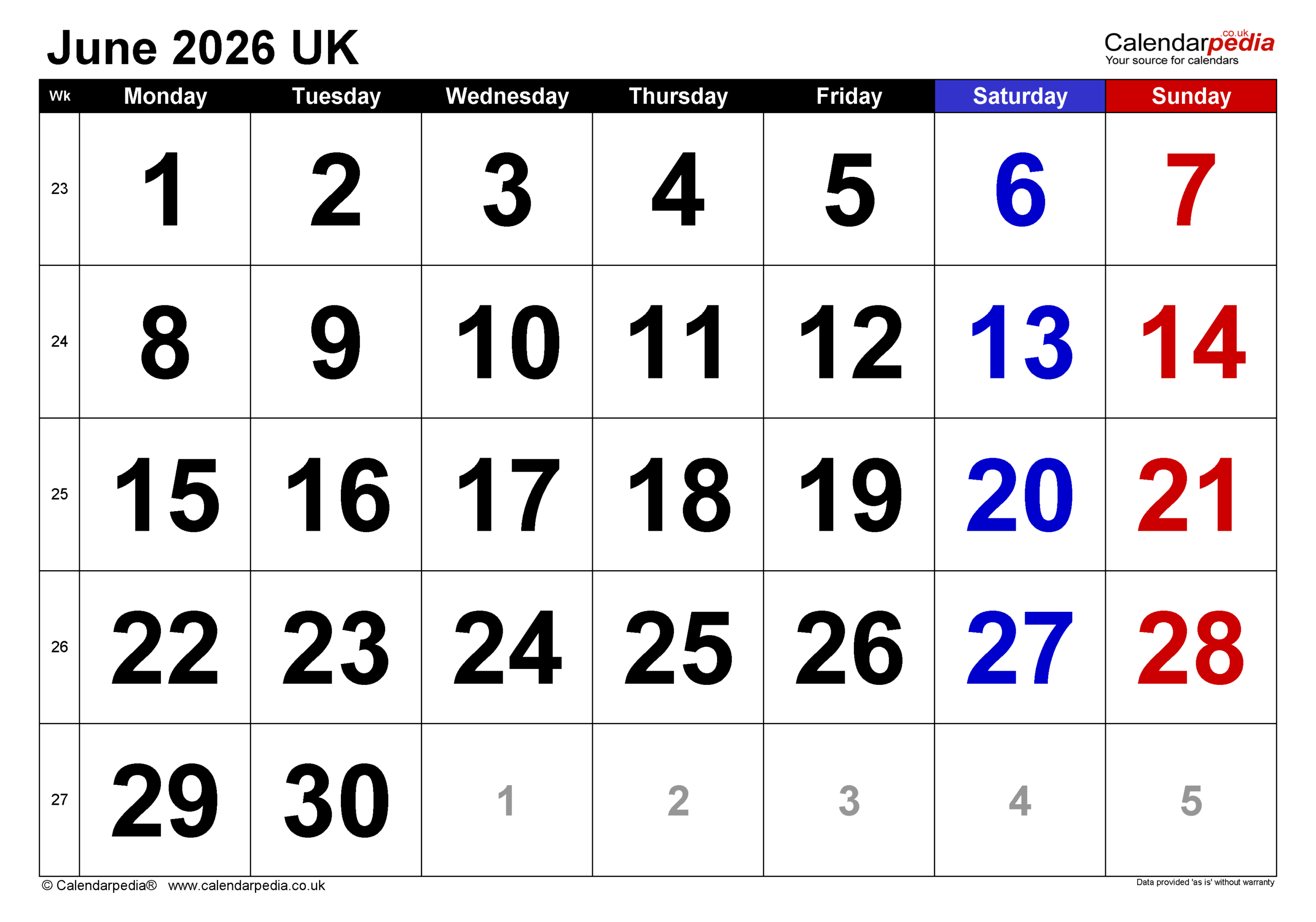 Calendar June 2026 UK With PDF Excel And Word Templates