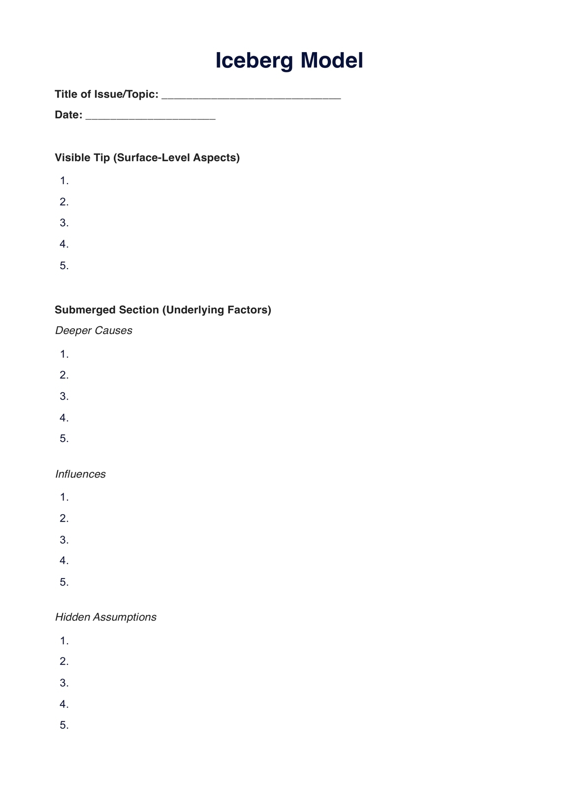 Iceberg diagrams are a great way to visually represent the concept of hidden or underlying factors. Whether you’re studying geology, psychology, or business, this worksheet will help you organize your thoughts and ideas effectively.