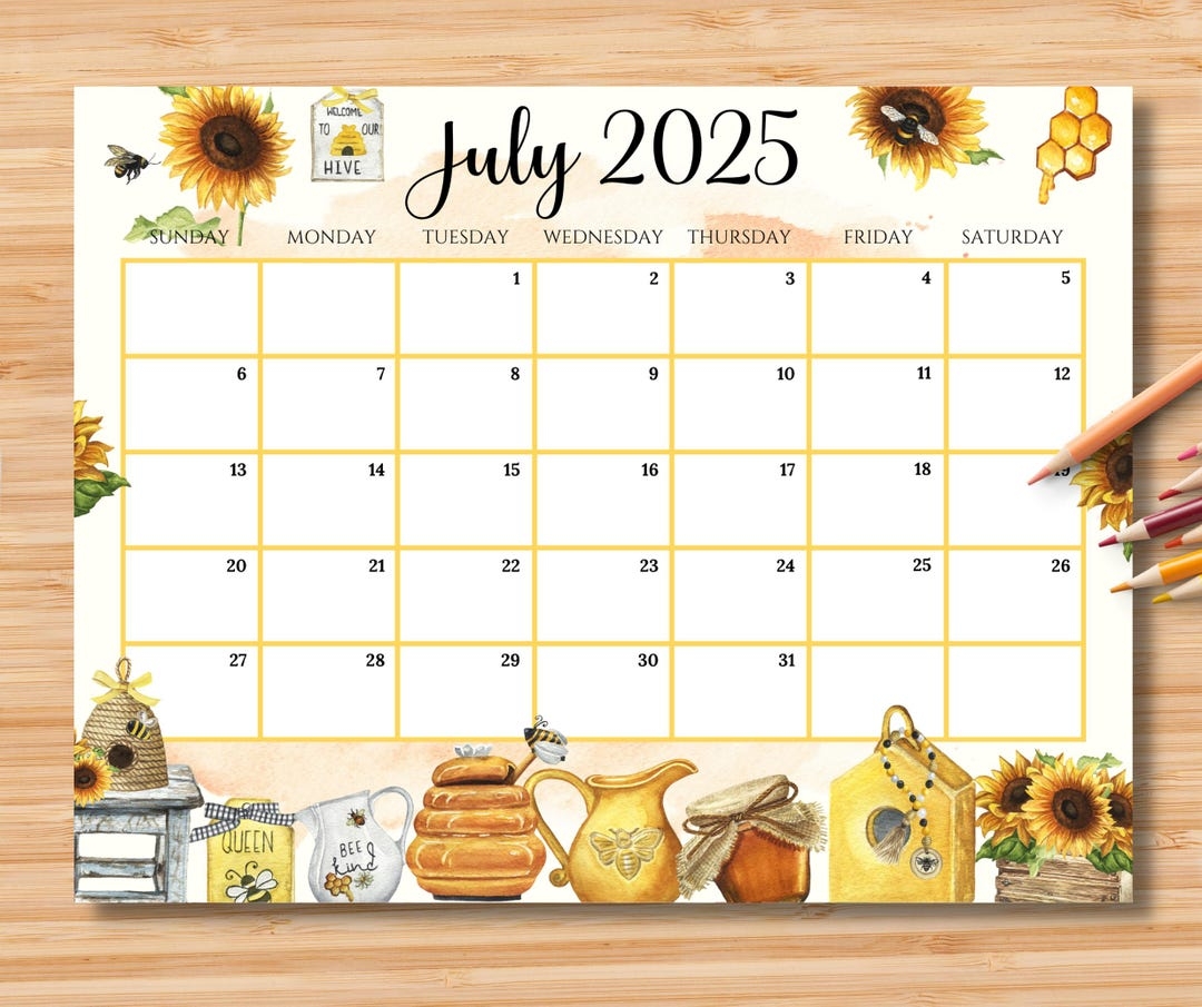 Editable July 2025 Calendar 4th July Independence Day Beautiful Summer With Honey Bee Printable Monthly Calendar Planner Instant Download Etsy